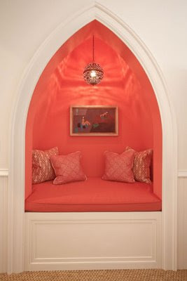 I love this little carved out reading nook. Painting the inside of the space creates a little jewel box - perfect for a cup of tea and a good book in the early morning or on a rainy day.